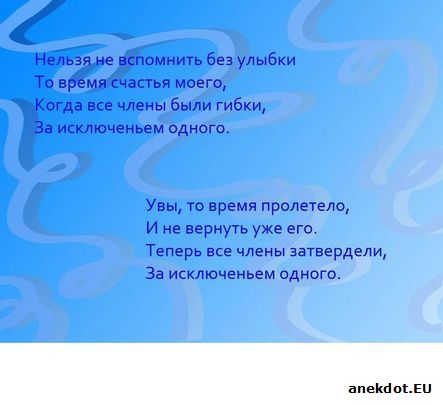 НАША ЖИЗНЬ... В первый день Бог создал корову и сказал ей: "Ты будешь все дни проводить в поле, давать молоко, кормить своих телят и семью фермера. За это я дарю тебе жизнь длиною в 60 лет." "За что мне такая адская жизнь на 60 лет!" — возмутилась корова, — "Мне хватит и двадцати, а остальные сорок оставь себе!" И Бог согласился. Во второй день Бог создал собаку и сказал ей: "Ты будешь все время сидеть у ворот своего дома и облаивать всех проходящих мимо. Дарю тебе жизнь длиною в 20 лет." "М-да, многовато для гавканья", — расстроилась собака, — "Мне хватит и десяти лет, а остальные забирай назад..." Бог опять согласился. И вот на третий день Бог создал человека и сказал ему: "Ешь, спи, развлекайся и наслаждайся жизнью, но сроку на это даю тебе 20 лет." Человек возмутился: "Что?! Только 20 лет!! Знаешь что, Бог, я беру свои 20 лет, потом 40 лет что корова тебе вернула, и еще 10 лет, которые отдала собака. Семидесяти лет мне вполне хватит, договорились?" "Ну, будь по-твоему...! " — вздохнул Бог. Вот так и сложилось, что первые 20 лет жизни мы спим, едим и развлекаемся, следующие 40 лет вкалываем, чтобы прокормить свою семью, а в последние 10 — сидим на крыльце и облаиваем каждого кто проходит мимо... |