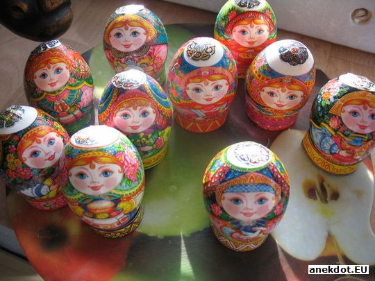Новый учитель достает несколько разноцветных яиц, вызывает к доске Вовочку и спрашивает: