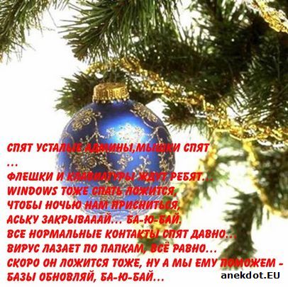 Спят усталые админы, мышки спят.. Флешки и клавиатуры ждут ребят. Windоws тоже спать ложится, Чтобы ночью нам присниться, Аську закрывааай. Ба-ю-бай.